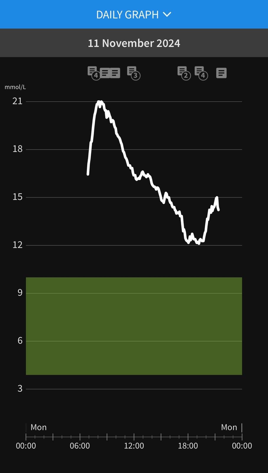 I was very excited when I found that you can pinch and zoom on the graph and then tap on any point to find the glucose reading at that time so this is much easier to find your peaks than the LibreLink app. The Dexcom apps also let you do this but you have to tap and hold on the dots which isn't quite as intuitive.