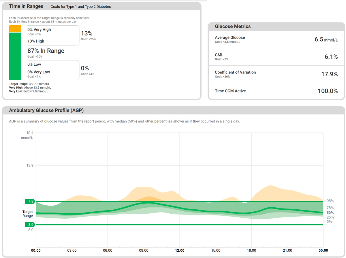 This would suggest that the Anytime CT-3 would probably be the best option for monitoring your long-term glucose management. Its Glucose Management Index (GMI) in its AGP report gives you an estimate for a HbA1C blood test.