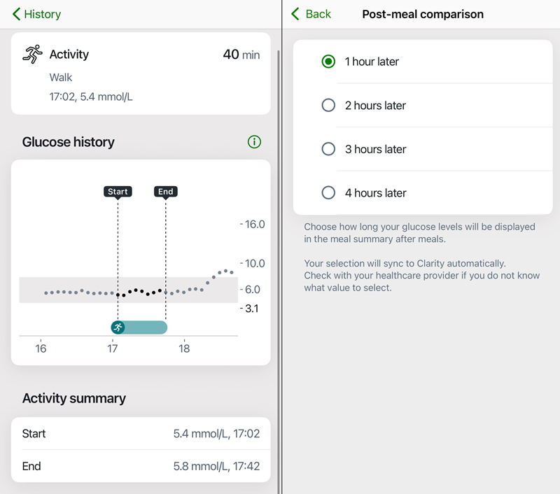 The stand-out feature on both Dexcom apps for me is the food and activity logging. They give you both a start and end point reading which is easy to set and review. When logging any activity you can enter how long you are planning to do the activity and it will automatically create a log for the end point. If your activity takes longer or shorter than planned, you can always update the time taken and the app will automatically update the end point reading. For food logging, it will automatically take a reading at a fixed time after you log the meal. You can choose a fixed interval from between one and four hours. I found one hour was good to get a rough idea of a spike level. You could set it to 3 or 4 hours if you want to be able to check that you're coming down to a baseline glucose level.