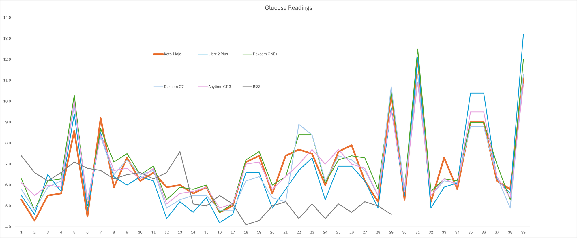 When reviewing all of the 40 individual readings from the KETO-MOJO glucose meter, the average came to 6.8 mmol/L and the Anytime CT-3 matched this exactly. The Dexcom G7 averaged at 6.7 and the Libre 2 was 6.6 mmol/L which does seem to indicate that the Libre 2 does tend to read a bit lower and the graph below shows this. The Dexcom ONE+ had a tendency to read a bit higher on average at 7.1 mmol/L. The RIZZ had averaged at 5.7 mmol/L, which is 17% out and I gave up taking readings with it after trying to reset it.