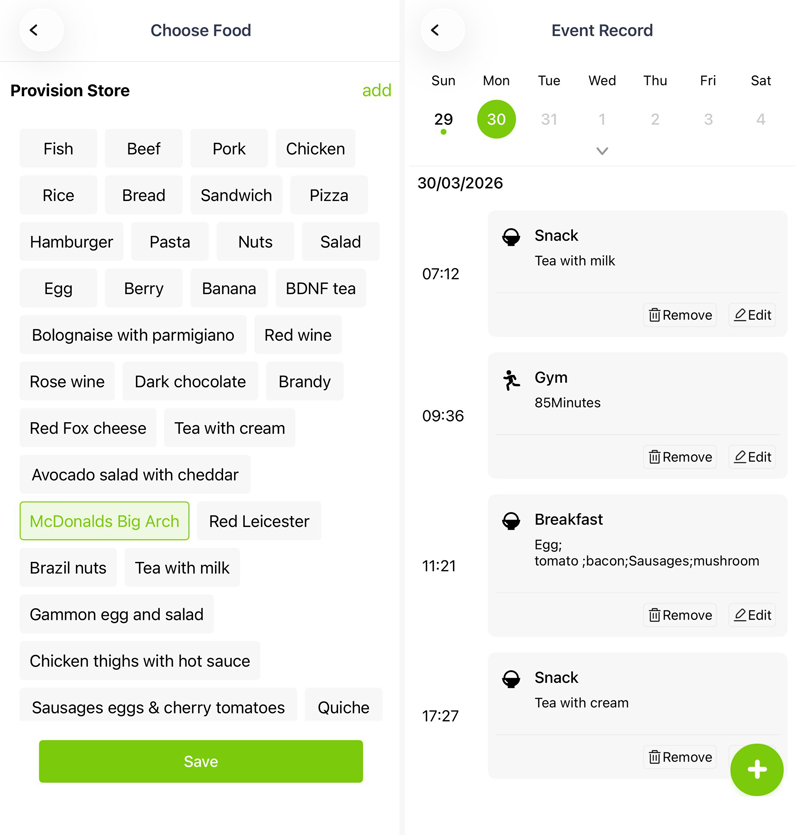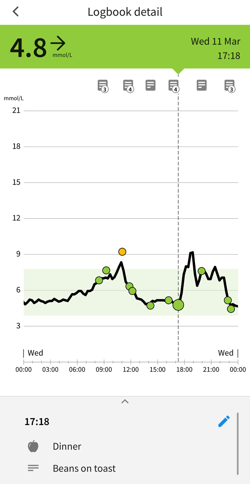 Logging food and activities is quick and easy with the Anytime app but a bit more basic in terms of looking back at the data. I really like the visual way of quickly tapping on a food or activity item from a list that you can update - this makes adding regular meals quick and easy as it saves a lot of typing. Be aware that you can't delete anything so stick to basic individual items like 'beef', 'potatoes' etc. rather than long menu-style labels. The resulting event record is just a list of times and items with no direct way of seeing the glucose values before and after. You have to make do with using the icons at the bottom of the graph on the home screen to find the data points. That can become difficult to figure out if you log a lot of entries. I've also noticed there's an issue with recording the exact time - it tends to be a few minutes behind but it doesn't stop you spotting patterns.