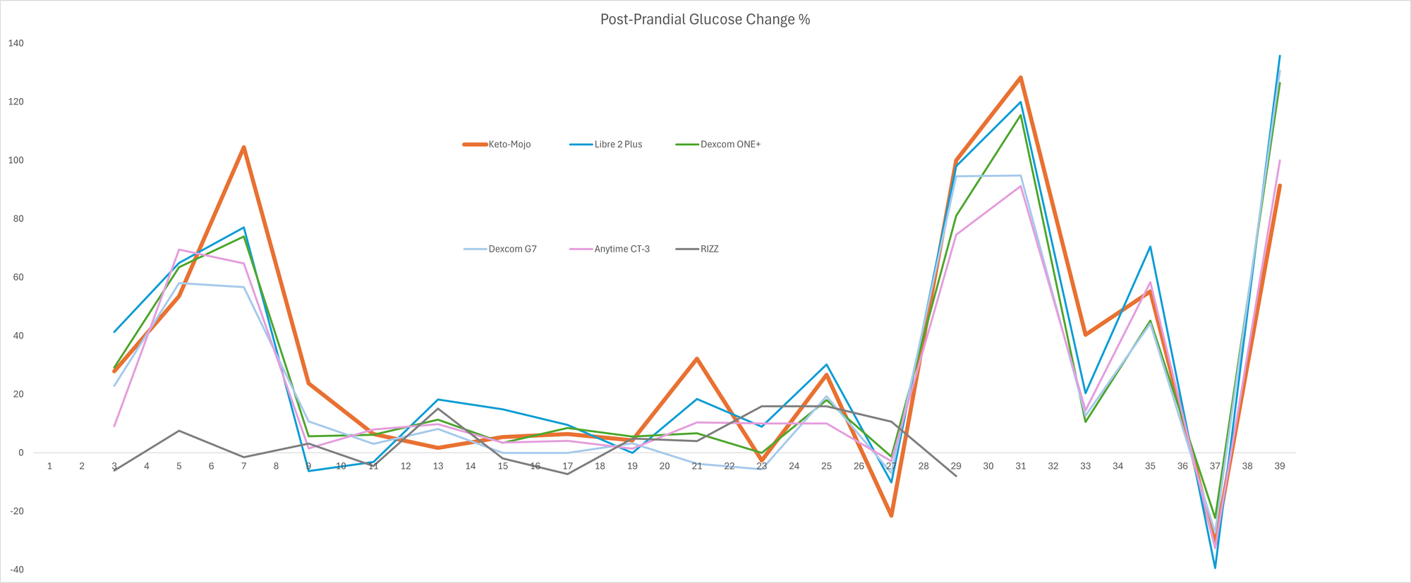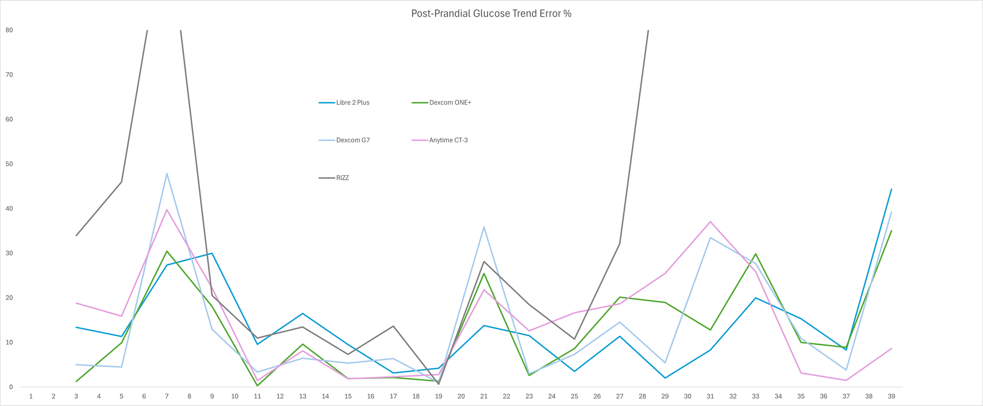 For me, the most important signal I get from my CGM is the amount of increase or decrease in blood glucose that results from a meal. By comparing the start and end point of each meal on each CGM I've worked out the error percentage in the increase or decrease when compared to the glucose meter. The RIZZ ring had some massive error rates as I think it just can't cope with higher ranges. From the point I started calibrating it, I think I made it worse so had to try resetting it and couldn't get it back up and running in time. The Dexcom G7 (light blue) generally had fewer errors but it had 3 more pronounced errors than the other standard CGMs. That shows that it's generally more accurate but when it does get it wrong, it's getting it wrong by quite a bit. The ONE+ (green) had more frequent high errors but not as pronounced. The Libre 2 (blue) generally had more frequent lower level errors so it's doing well at showing consistent patterns without showing extreme false positives. The Anytime CT-3 has fewer errors but matches similar overly pronounced errors as the G7 - from this experiment, I'd say the CT-3 has a nice balance between pattern consistency and overall accuracy.