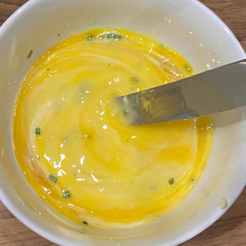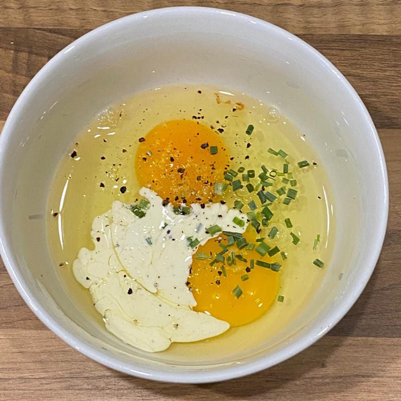 Crack the eggs into a mixing bowl or jug. Add a quick dollop of cream along with the chives, freshly ground black pepper, and a generous pinch of salt.