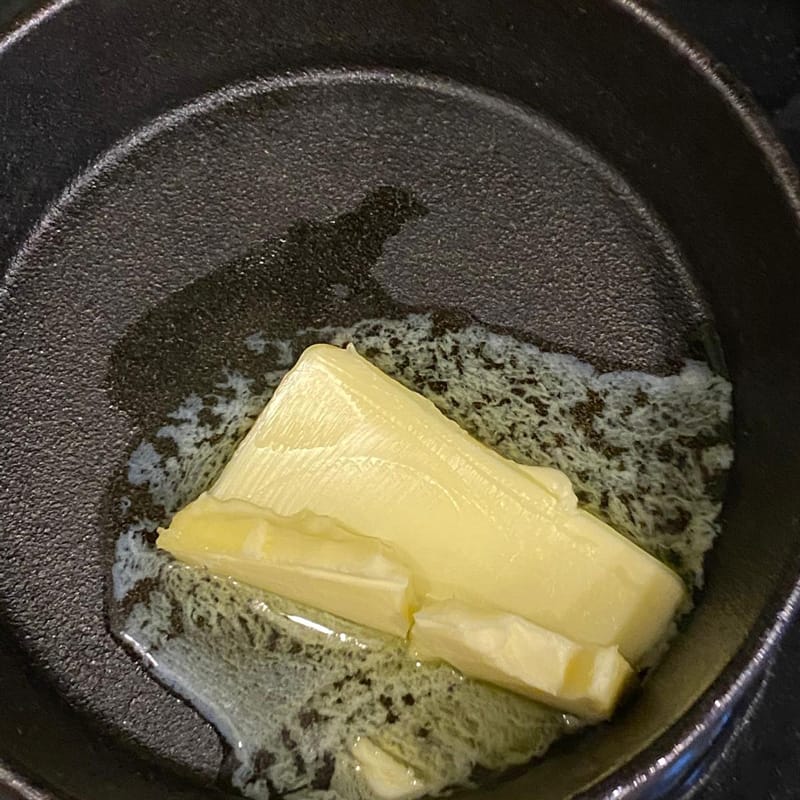 Put the cast iron pan on the hob on a low heat. Add a knob of butter to the pan using a knife and then use the knife to mix up the egg mixture while the butter is melting.