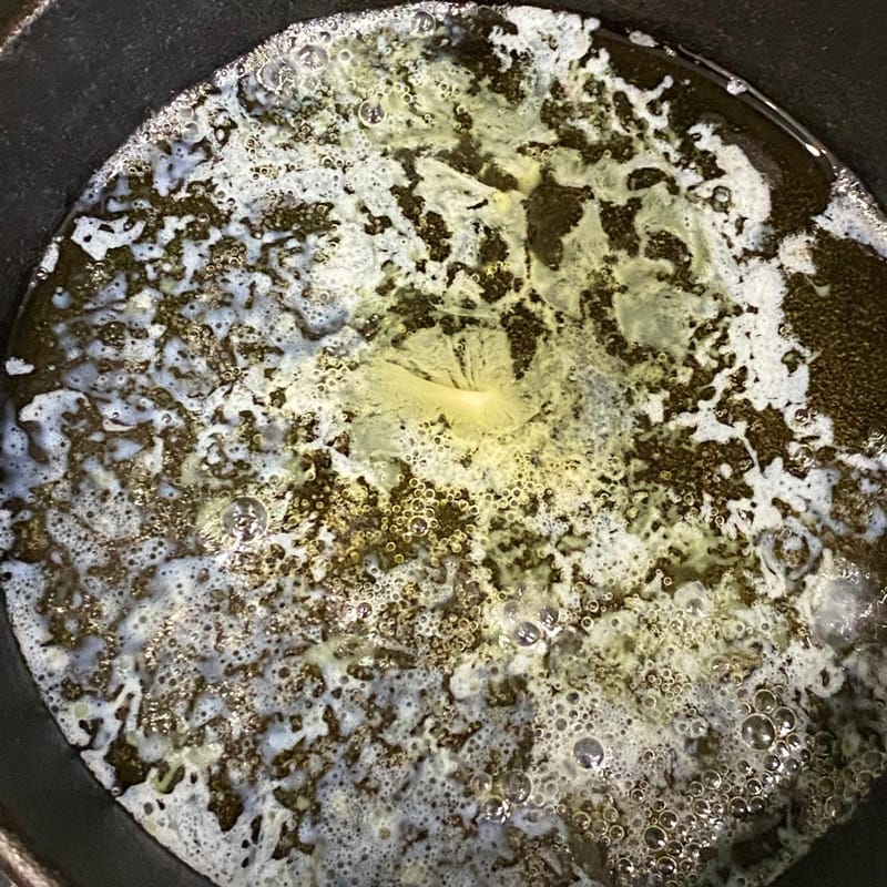 When the butter has just about melted and it's starting to bubble, pour the egg mixture into the pan. Do not be tempted to mix anything or scrape around the edges at this point.